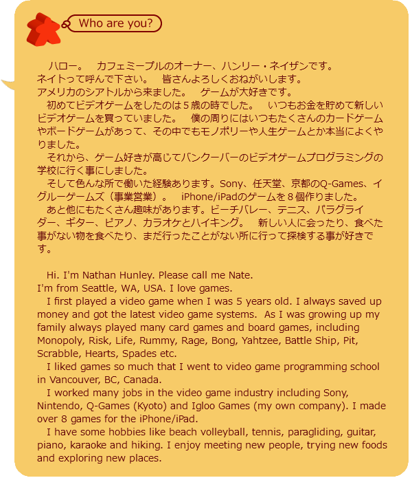 Cafe Meepleのオーナー ネイトの紹介です。